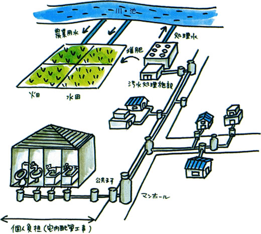 私たちの家庭の台所やトイレ・風呂・洗面所からでる生活排水を道路の下などに埋められた下水管で処理場へ運び、処理をしてきれいになった水を川や池にもどし、農業用水等に再利用します。