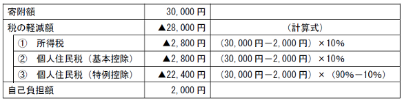東京都在住で三木町出身のAさん(家族構成が夫婦と子ども2人、年収が700万円、個人住民税所得割額が30万円、所得税率が10%)が3万円を寄附した場合の計算は以下のとおりです。