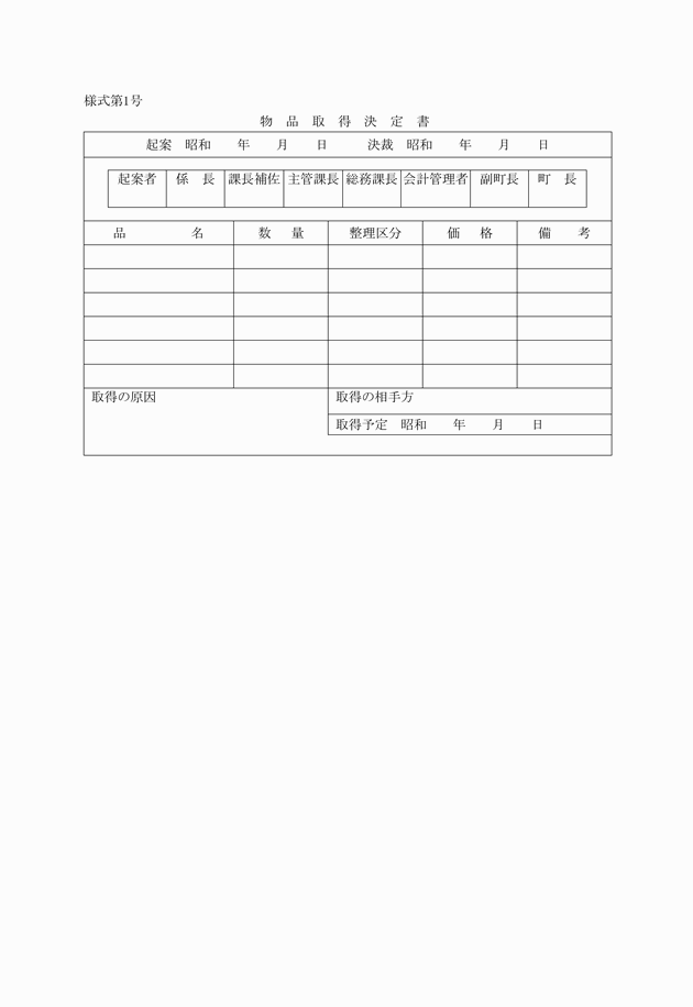 第7条 物品管理者は、寄附により、又は公有財産若しくは占有動産からの編入により物品を取得しようとするときは、これを物品取得決定書(様式第1号)により決定しなければならない。