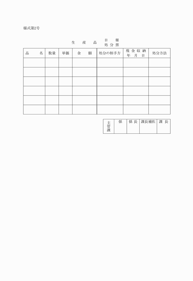 第8条 物品管理者は、物品が試験又は実習により製作され、収穫され、その他生産されたときは、試験又は実習に従事した職員から生産品日報(様式第2号)を提出させ、これにより確認しなければならない。