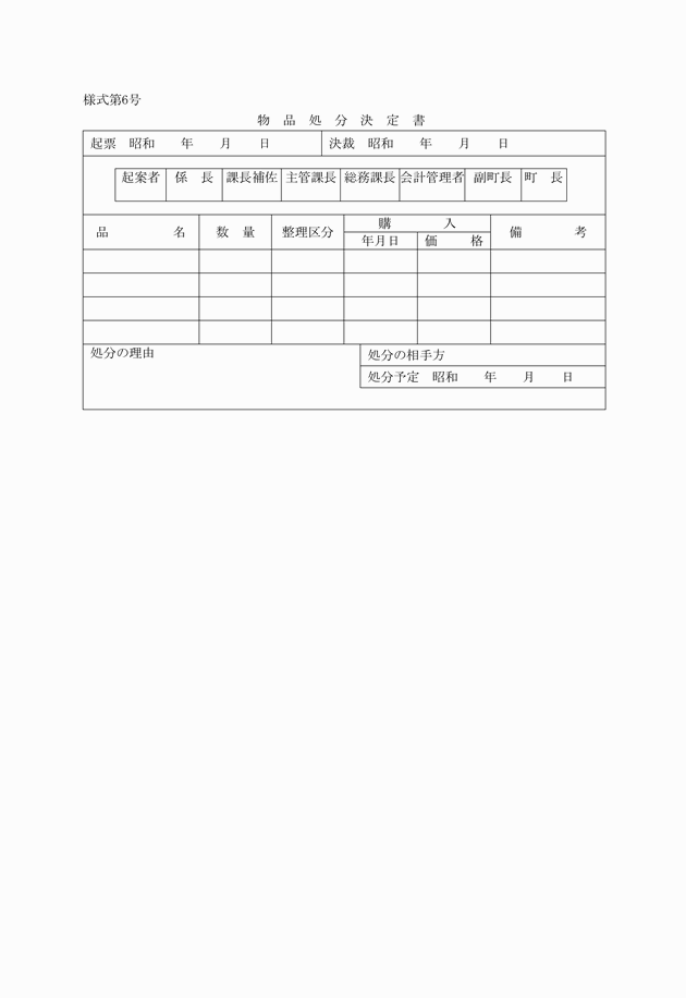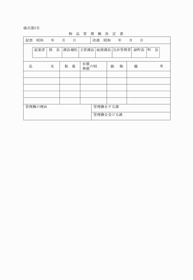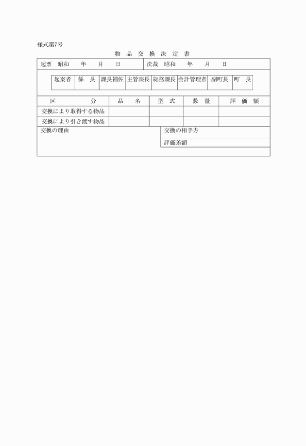 第21条 物品管理者は、その管理に属する物品をその町以外の者の所有する物品と交換しようとするときは、物品交換決定書(様式第7号)によりこれを決定しなければならない。