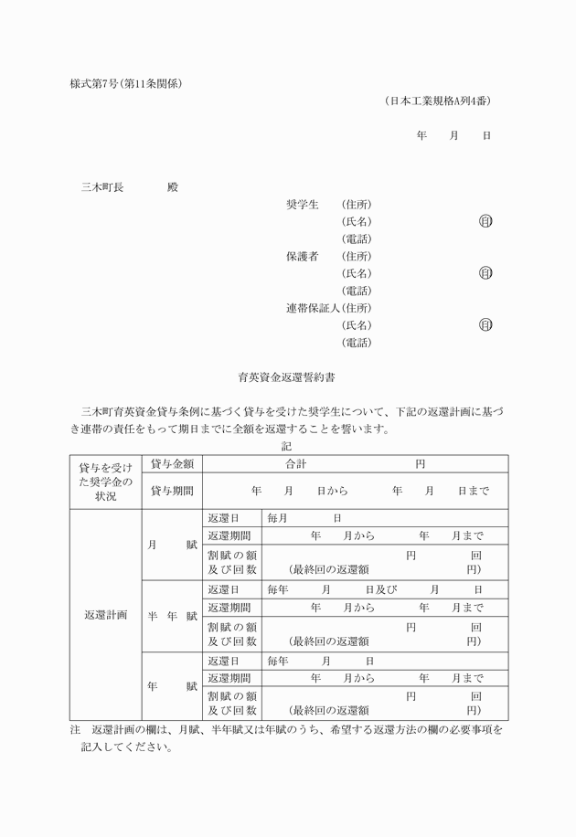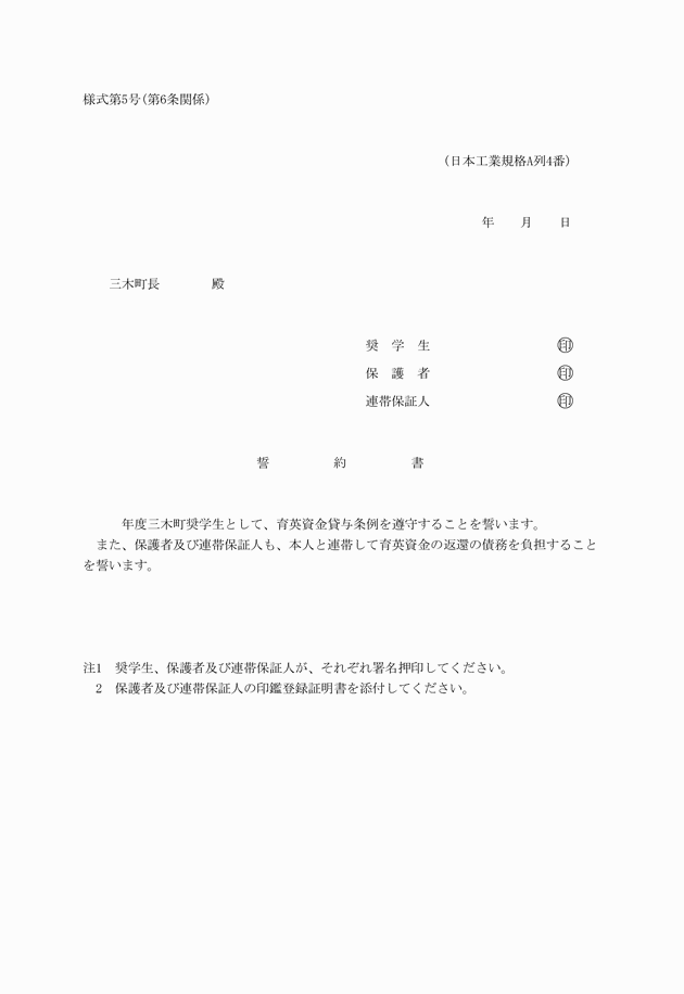 2 奨学生は、通知を受けた日から10日以内に保護者及び連帯保証人連署の誓約書(様式第5号)を、教育委員会を経て町長に提出しなければならない。