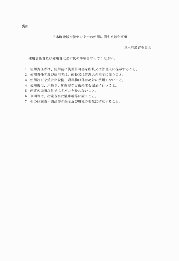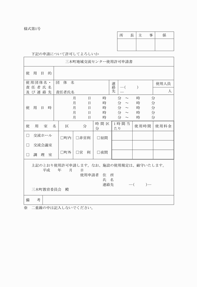 第5条 交流センターを使用しようとする者(以下「使用者」という。)は、使用する日の属する月の前月20日までに、交流センター使用許可申請書(様式第1号)を教育委員会に提出し、許可を受けなければならない。