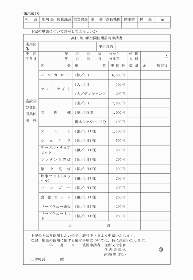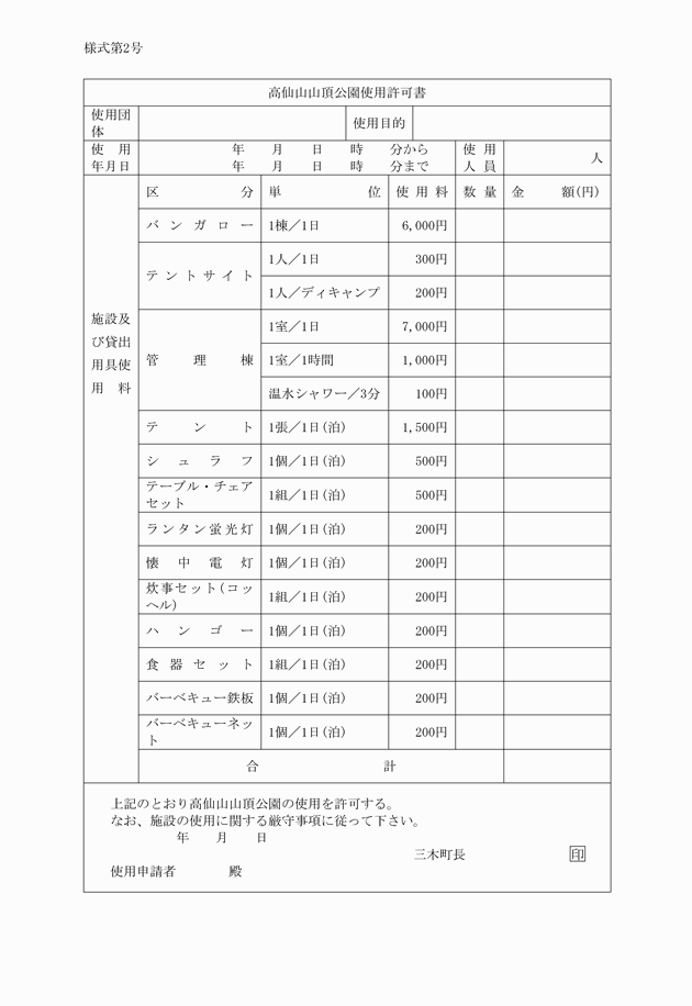 第4条 町長は、使用の許可をしたときは、高仙山山頂公園使用許可書(様式第2号)を申請者に交付する。