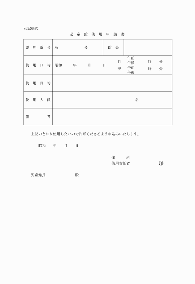 第7条 集会等のために児童館を使用するときは、あらかじめ児童館使用申請書(別記様式)を館長に提出し、その許可を得なければならない。