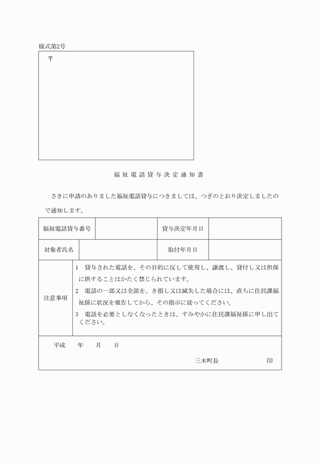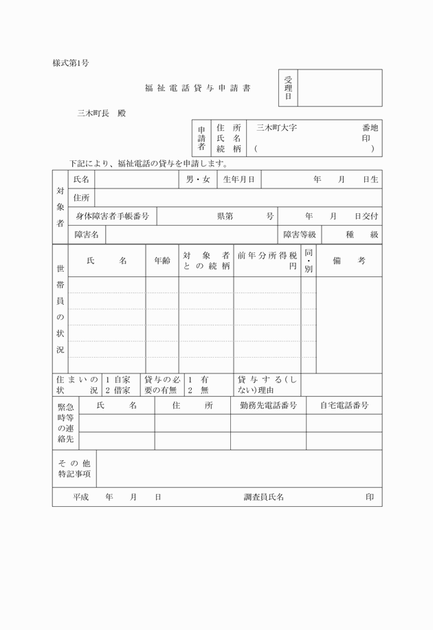 第3条 福祉電話の貸与を受けようとする者は、福祉電話貸与申請書(様式第1号)を町長に提出しなければならない。