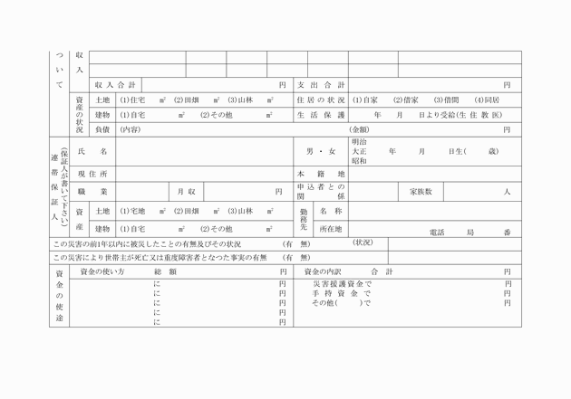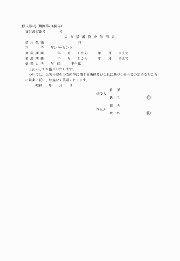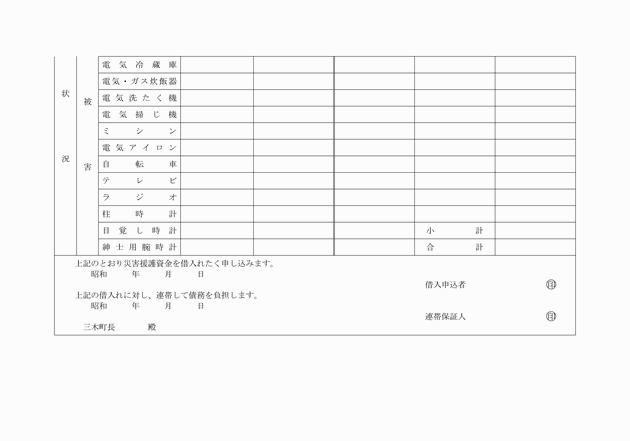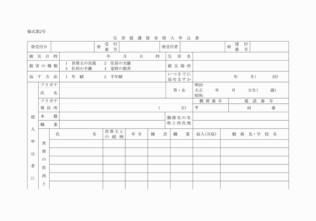 第6条 災害援護資金(以下「資金」という。)の貸付けを受けようとする者(以下「借入申込者」という。)は、次に掲げる事項を記載した借入申込書(別紙様式第2号)を、町長に提出しなければならない。