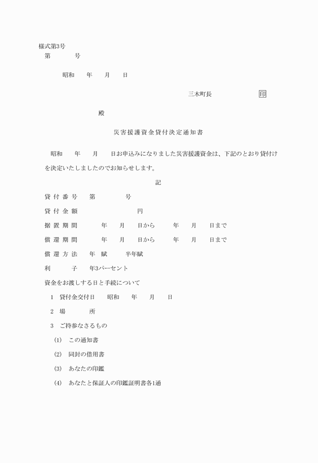 第8条 町長は、借入申込者に対して資金を貸し付ける旨を決定したときは、貸付金の金額、償還期間及び償還方法を記載した貸付決定通知書(別紙様式第3号)を、借入申込者に交付するものとする。