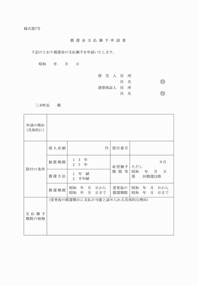 第13条 借受人は、償還金の支払猶予を申請しようとするときは、支払猶予を受けようとする理由、猶予期間その他町長が必要と認める事項を記載した申請書(別紙様式第7号)を、町長に提出しなければならない。