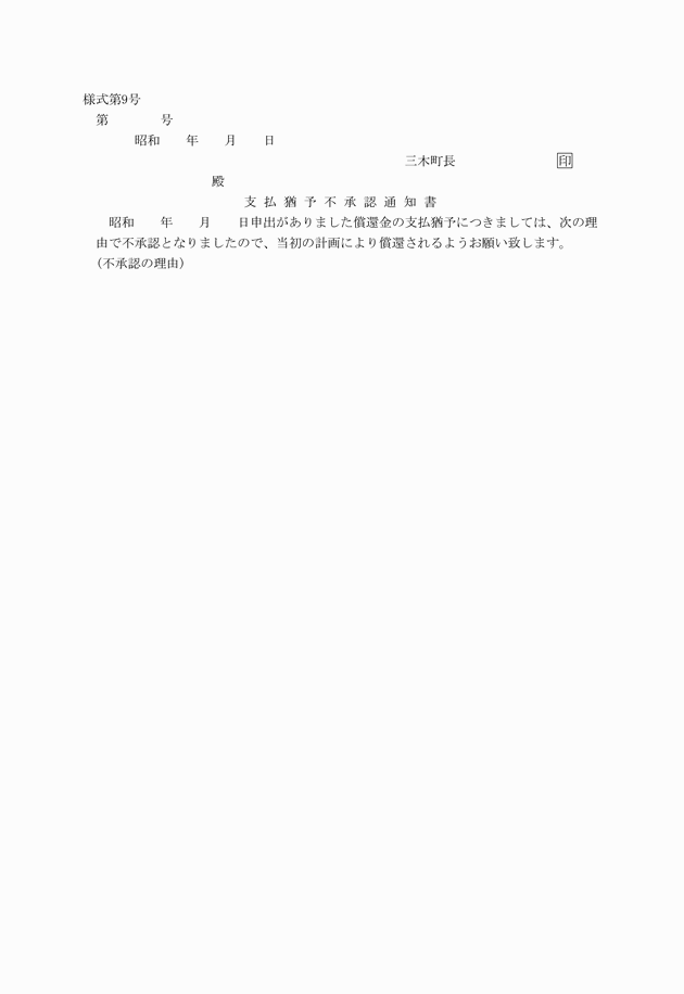 3 町長は、支払の猶予を認めない旨の決定をしたときは、支払猶予不承認通知書(別紙様式第9号)を、当該借受人に交付するものとする。