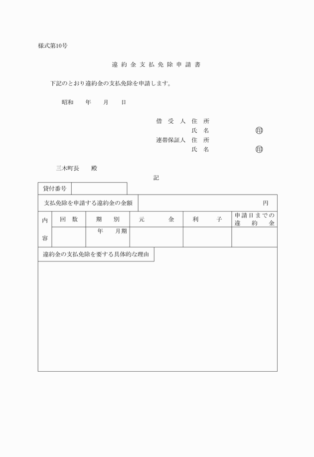 第14条 借受人は、違約金の支払免除を申請しようとするときは、その理由を記載した申請書(別紙様式第10号)を町長に提出しなければならない。