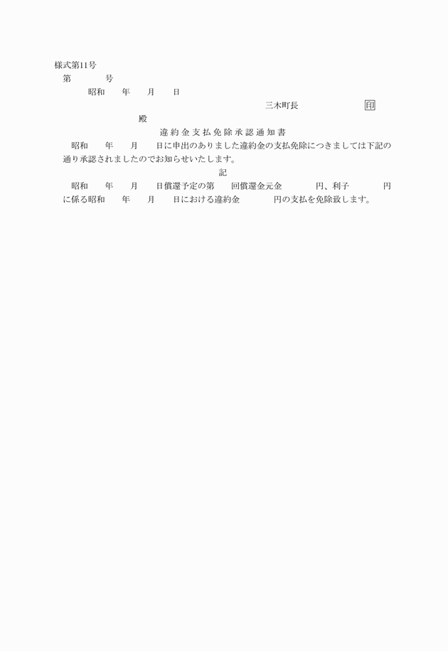 2 町長は、違約金の支払免除を認める旨を決定したときは違約金の支払免除した期間及び支払を免除した金額を記載した違約金支払免除承認通知書(別紙様式第11号)を当該借受人に交付するものとする。
