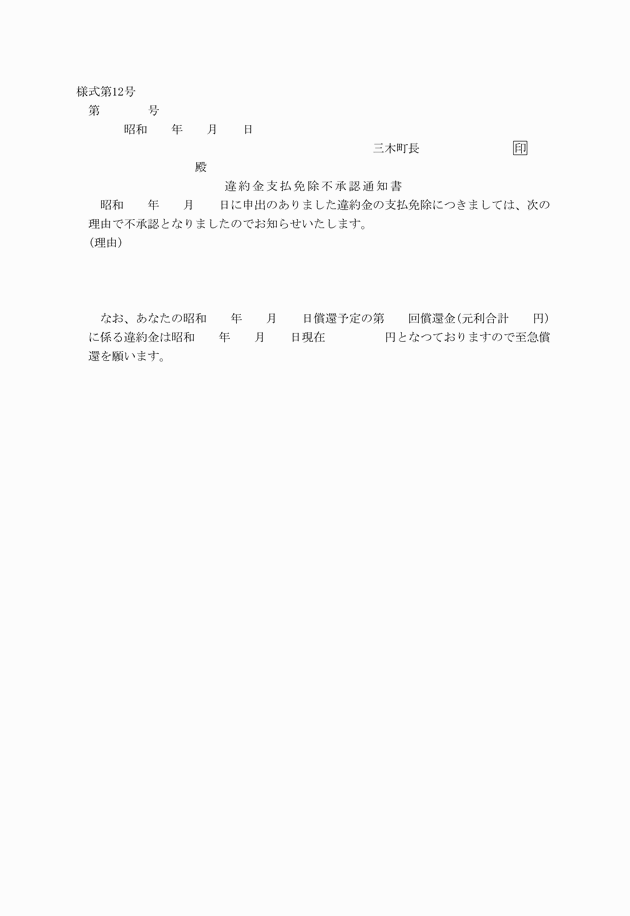 3 町長は、支払免除を認めない旨を決定したときは、違約金支払免除不承認通知書(別紙様式第12号)を、当該借受人に交付するものとする。