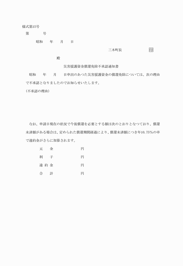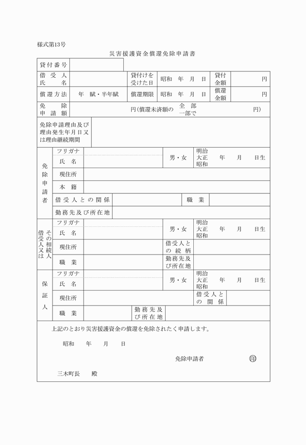 第15条 災害援護資金の償還未済額の全部又は一部の償還の免除を受けようとする者(以下「償還免除申請者」という。)は、償還免除を受けようとする理由その他町長が必要と認める事項を記載した申請書(別紙様式第13号)を、町長に提出しなければならない。
