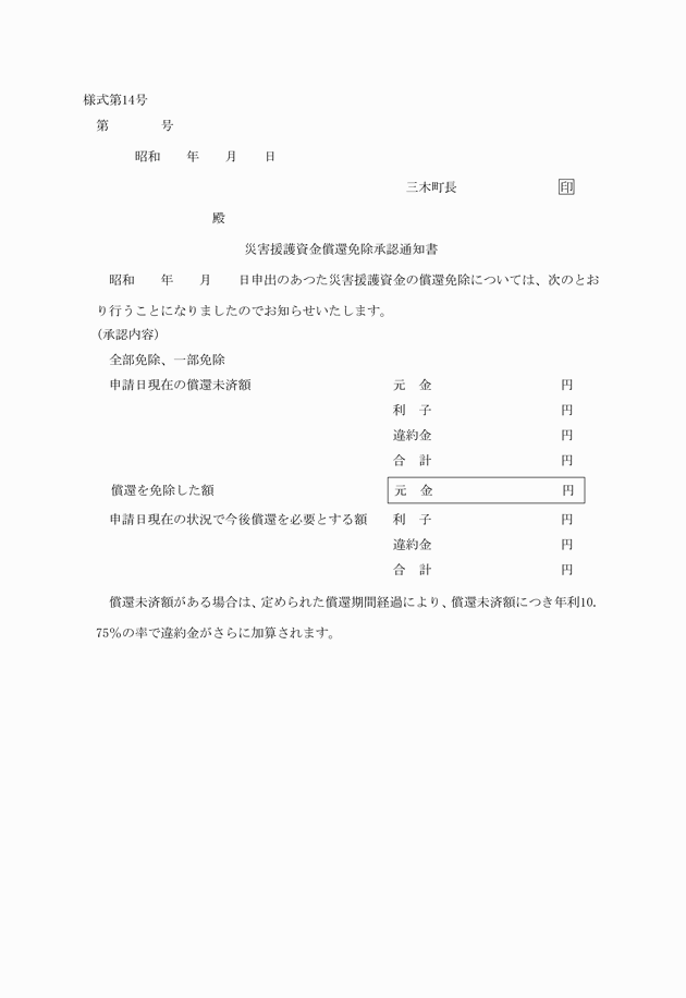 3 町長は、償還の免除を認める旨を決定したときは、償還免除承認通知書(別紙様式第14号)を、当該償還免除申請者に交付するものとする。