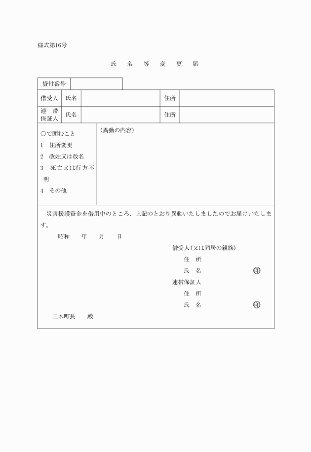 第17条 借受人又は保証人について氏名又は住所の変更等借用書に記載した事項に異同を生じたときは、借受人は速やかに、その旨を町長に氏名等変更届(別紙様式第16号)を提出しなければならない。ただし、借受人が死亡したときは、同居の親族又は保証人が代ってその旨を届け出るものとする。