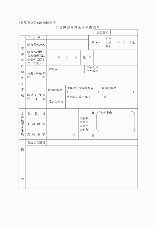 第4条 町長は、条例第9条の規定により災害障害見舞金を支給するときは、次に掲げる事項の調査を行った上災害障害見舞金の支給を行うものとする。
