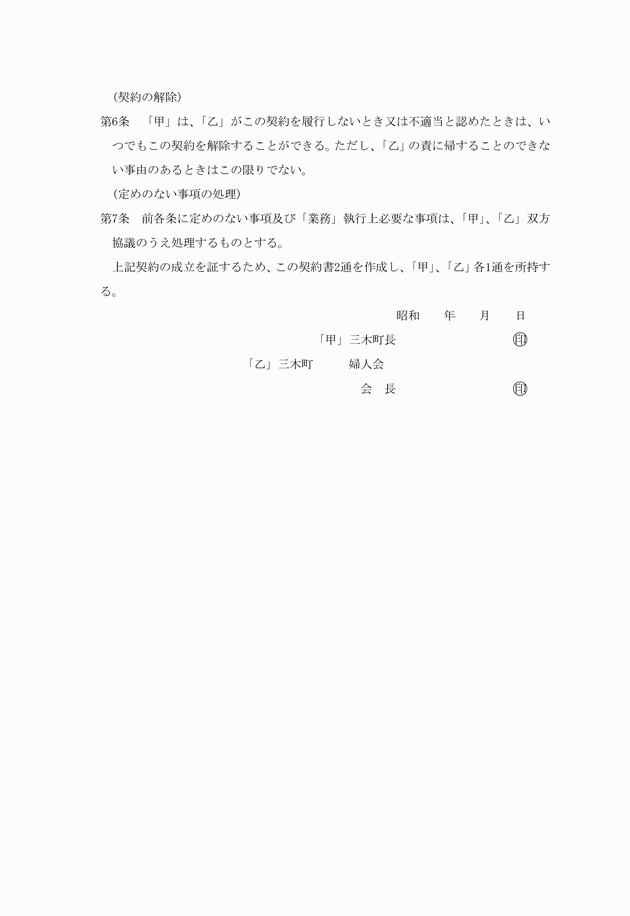 第2条 再委託団体は、町内各地区婦人会組織とする。ただし、特別の事由により各地区婦人会長及び町長が認めた場合は、その組織団体とする。