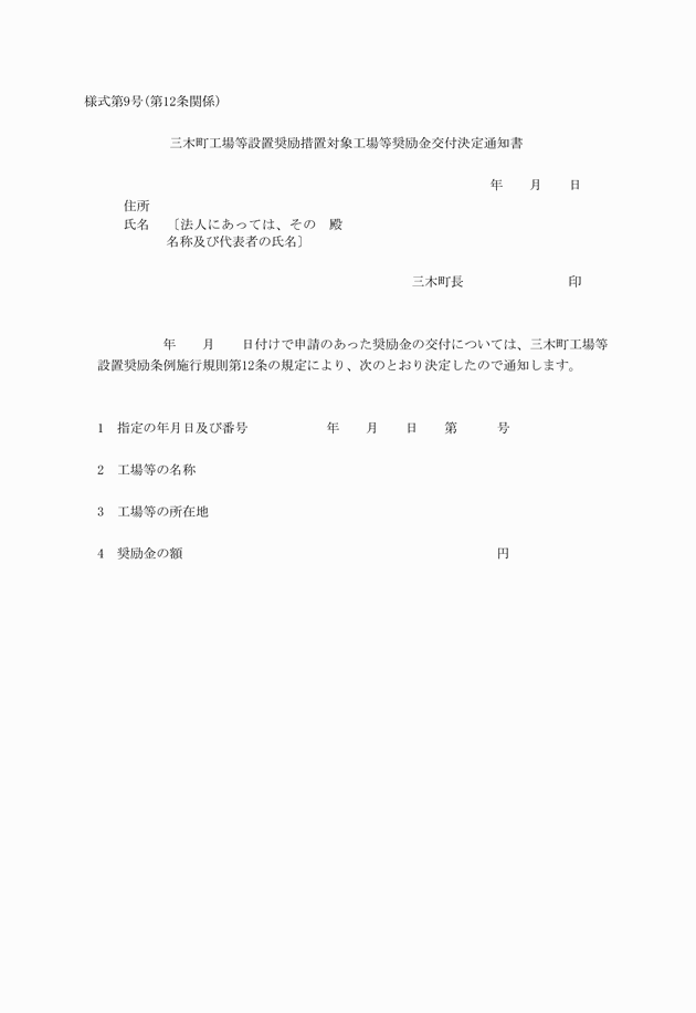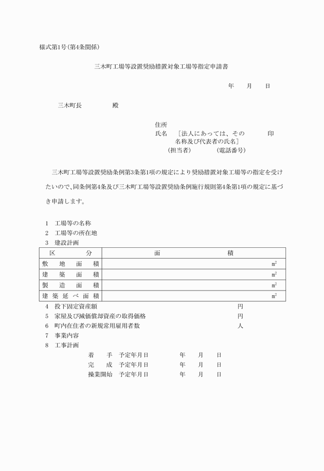 第1条 この規則は、三木町工場等設置奨励条例(昭和37年三木町条例第16号。以下「条例」という。)の施行に関し必要な事項を定めるものとする。