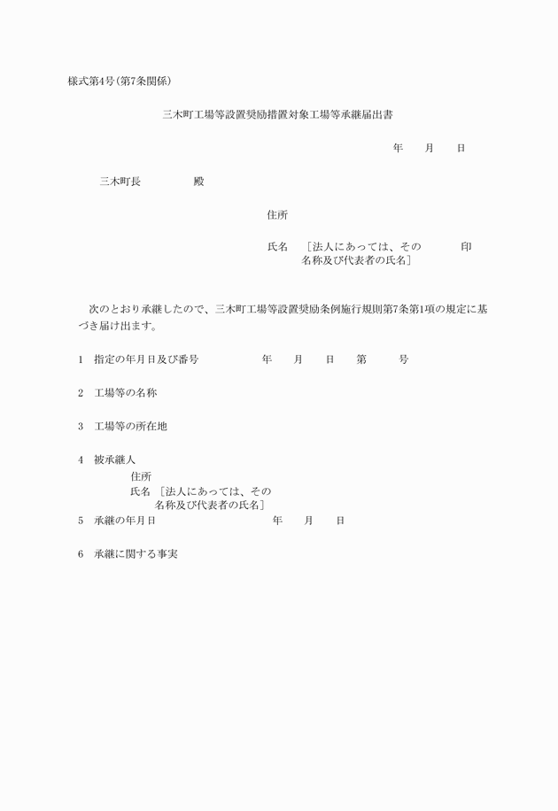 第7条 合併等により指定企業の地位を継承したものは、その承継の日から30日以内に承継届出書(様式第4号)を町長に提出しなければならない。