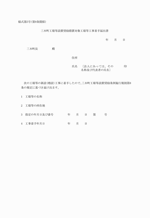 第8条 指定工場等は、当該施設の新設又は増設の工事に着手したときは、遅滞なく、工事着手届出書(様式第5号)を町長に提出しなければならない。
