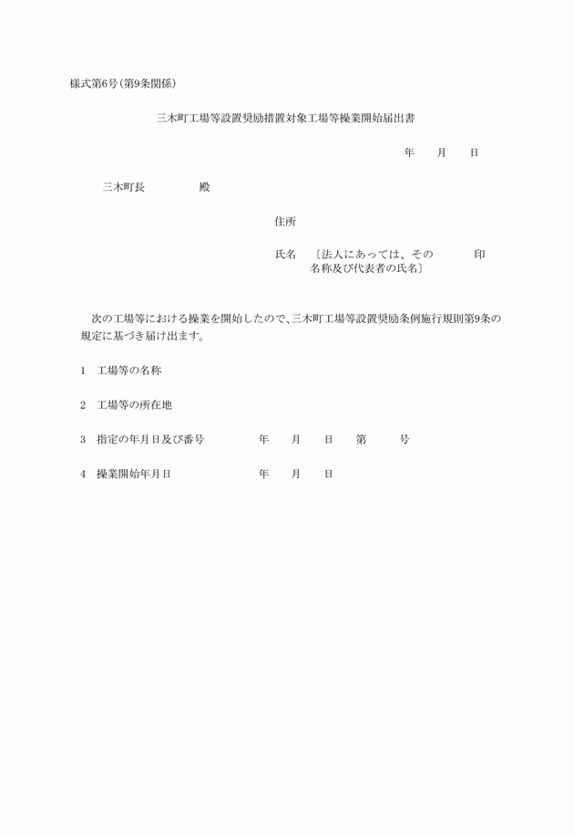 第9条 指定工場等は、当該施設における操業を開始したときは、遅滞なく、操業開始届出書(様式第6号)を町長に提出しなければならない。