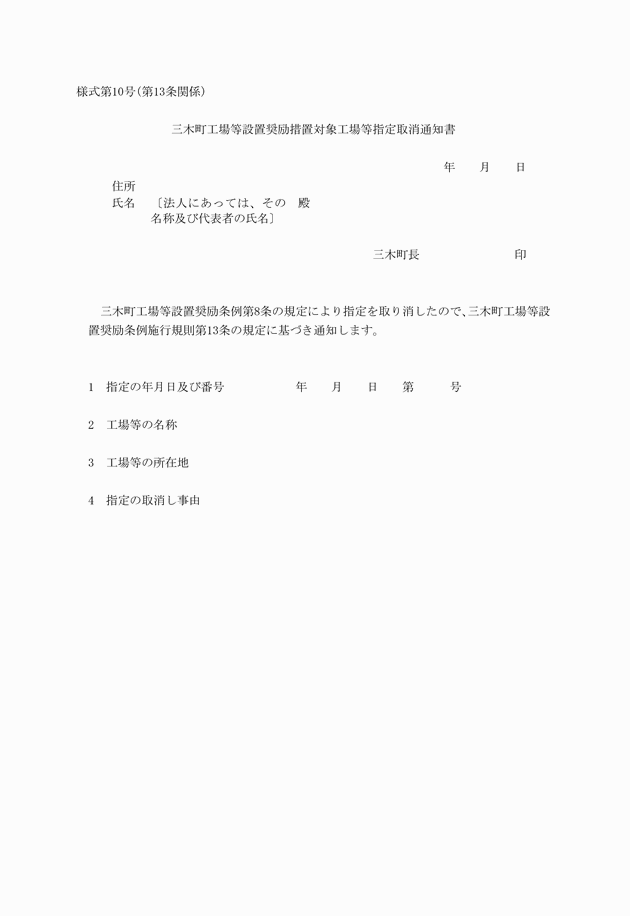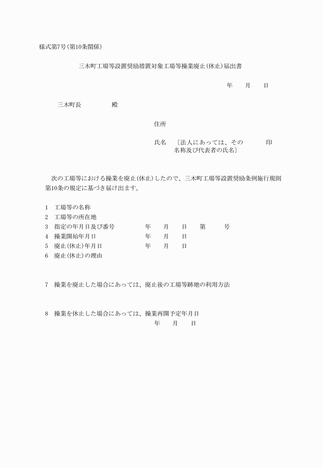 第10条 指定工場等は、当該施設の操業の開始日から奨励金の交付を受けるまでの間に、当該施設における操業を廃止し、又は休止したときは、遅滞なく、操業廃止(休止)届出書(様式第7号)を町長に提出しなければならない。