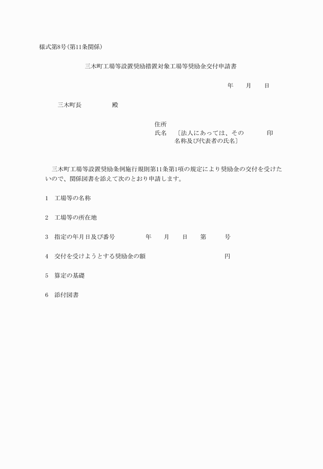第11条 奨励金を受けようとする指定工場等は、奨励金交付申請書(様式第8号)を町長に提出しなければならない。