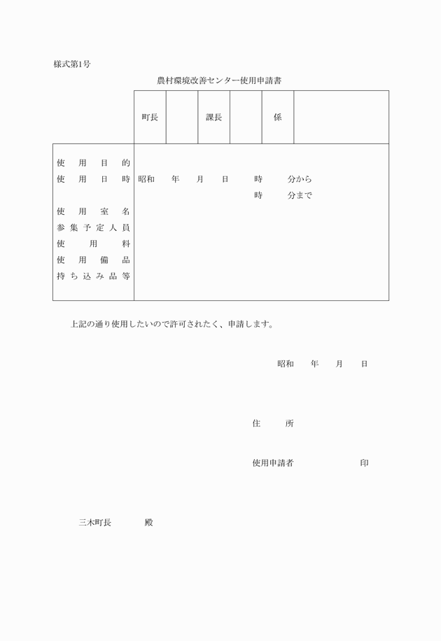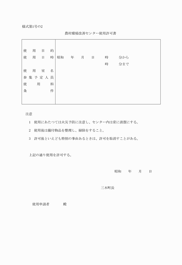 第4条 改善センターを使用しようとする者は、使用申請書(様式第1号)により申請し、許可を受けなければならない。