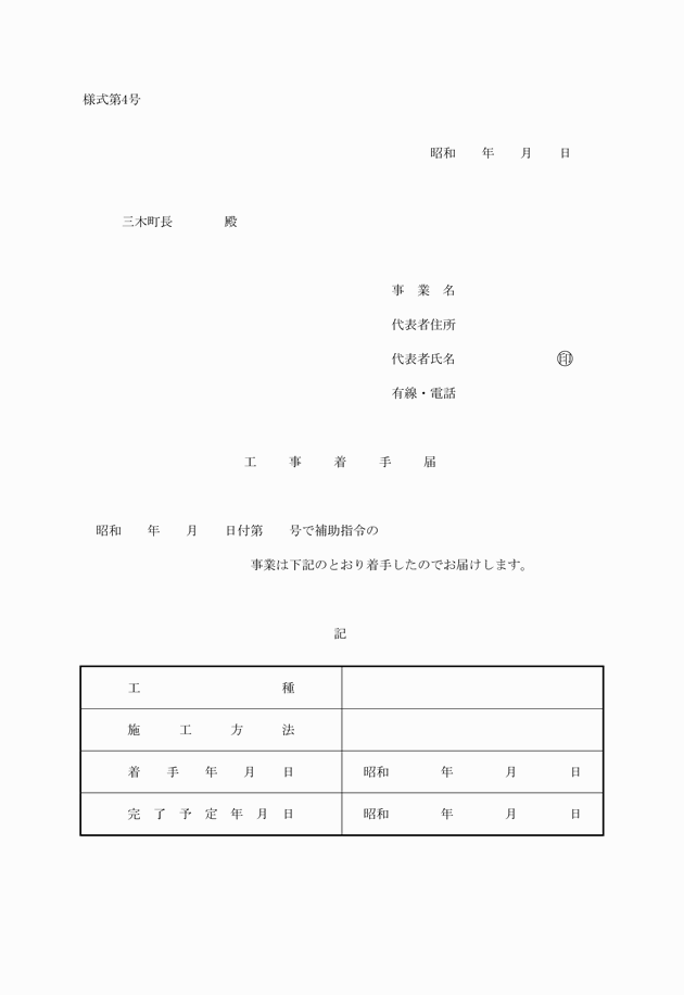 第9条 補助金交付の指令を受けた者(以下「事業者」という。)は、工事に着手したときは、直ちに工事着手届(様式第4号)を町長に提出しなければならない。