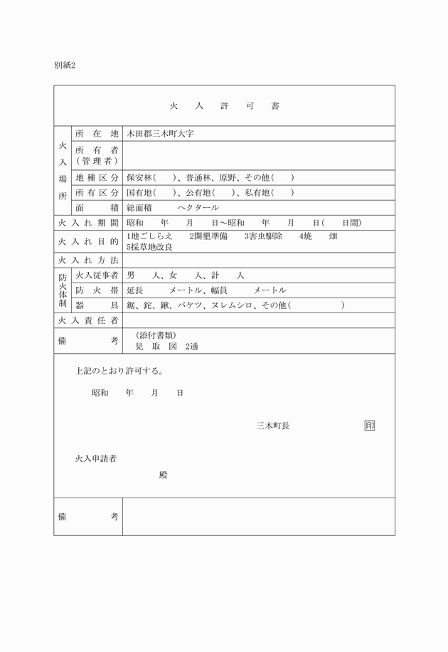 第7条 この条例の施行の際現にある第9条の規定による改正前の三木町火入れに関する条例別紙1(次項において「旧様式」という。)により使用されている書類は、この条例による改正後の様式によるものとみなす。