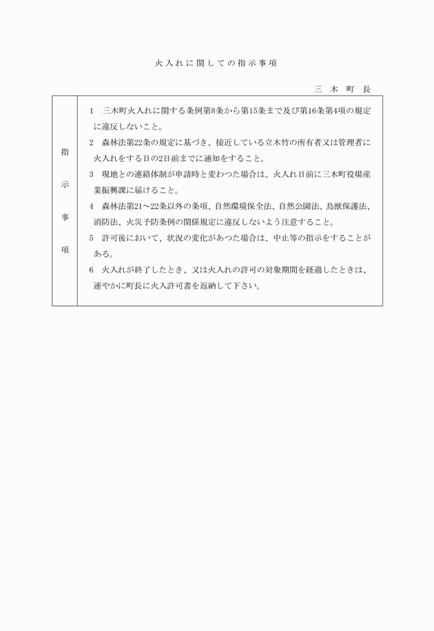 第5条 町長は、火入れの許可をした後において延焼その他危害の発生のおそれが生じたときは、森林法第21条の規定に基づき火入れの差止め又は火入れの方法若しくは期日の変更その他必要な指示を行うことができる。