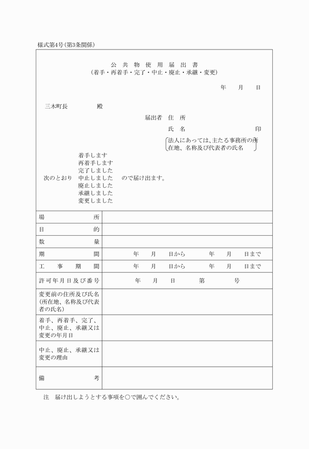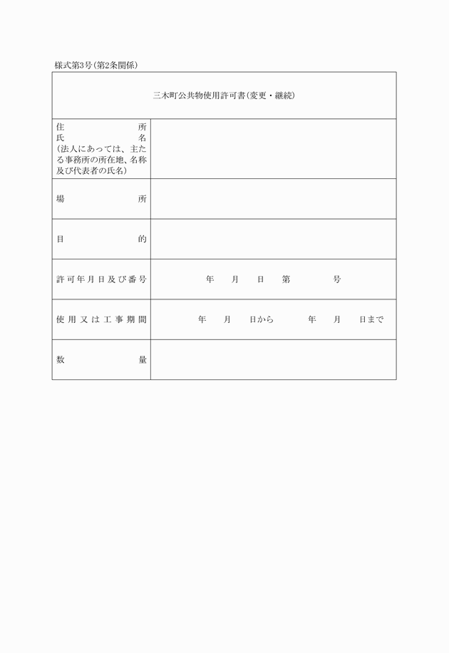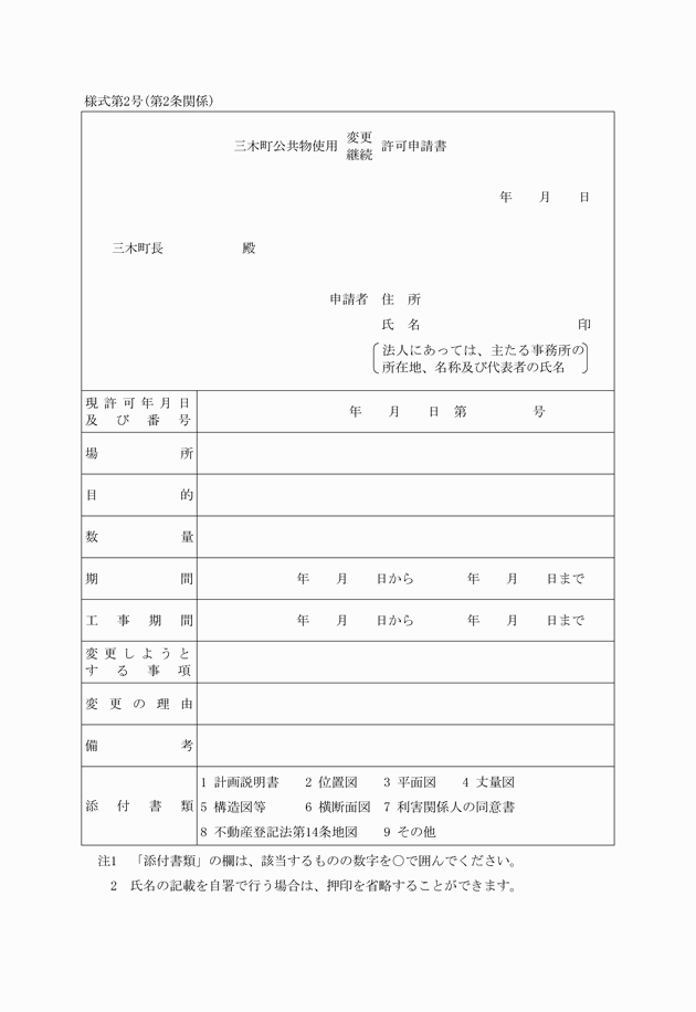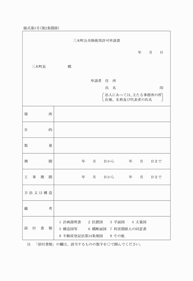 第2条 条例第4条第1項各号に規定する行為(以下「公共物の使用」という。)の許可を受けようとする者は、公共物使用許可申請書(第1号様式。以下「申請書」という。)に次の各号に掲げる関係図書を添付して、町長に申請しなければならない。