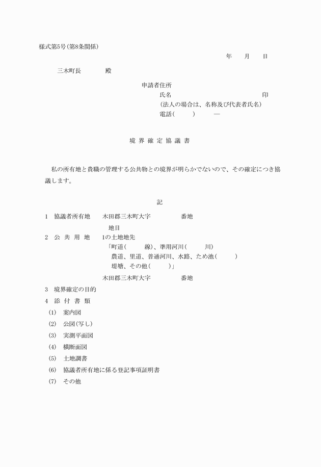 第8条 公共物の隣接地の所有者が、公共物との境界を明らかにするための協議を求めようとするときは、境界確定協議書(様式第5号)に公図の写しその他の書類を添えて町長に提出しなければならない。