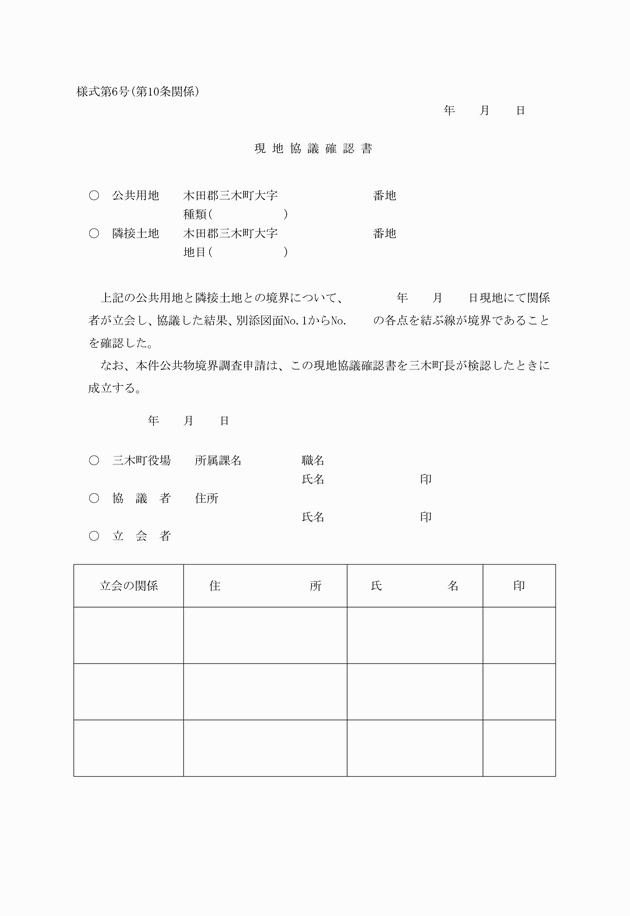 第10条 公共物と隣接地との境界が確定した隣接地の所有者は、境界について確認を求めようとするときは、現地協議確認書(様式第6号)を町長に提出しなければならない。