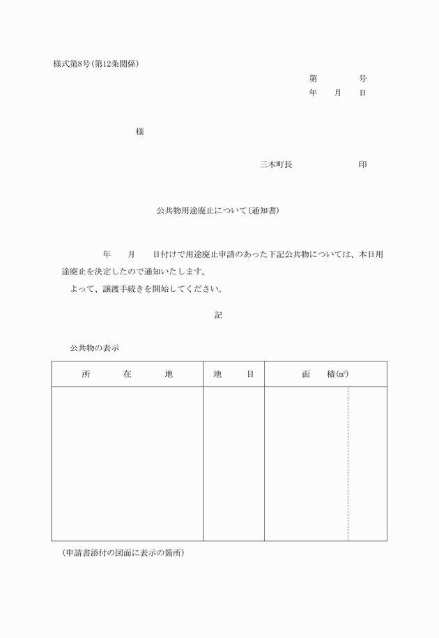 第12条 町公共物の用途廃止を申請しようとする者(原則として隣接土地所有者)は、公共物用途廃止申請書(様式第7号)を町長に提出しなければならない。