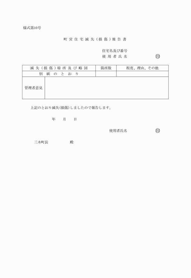 第12条 入居者は、当該住宅又は共同施設(管理事務所を除く。)について、滅失又は損傷があった場合は、様式第10号によりその状況を町長に報告しなければならない。