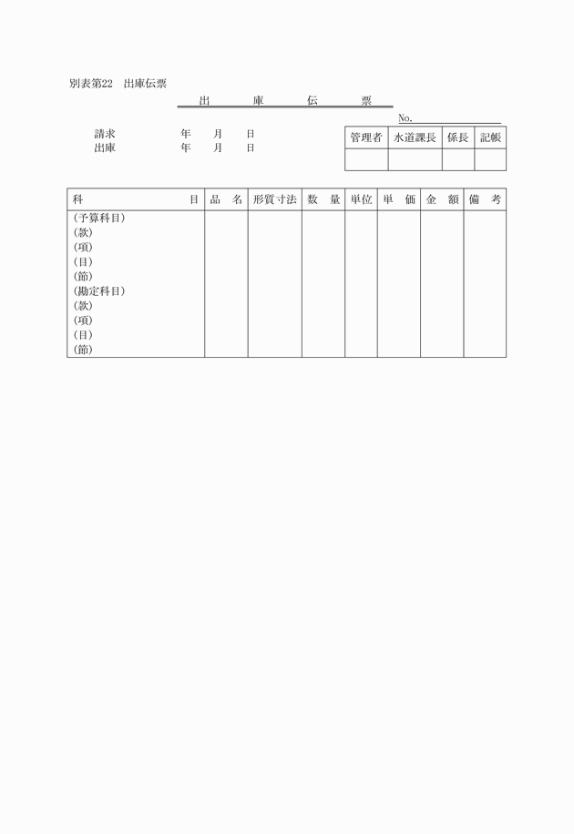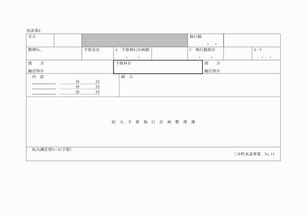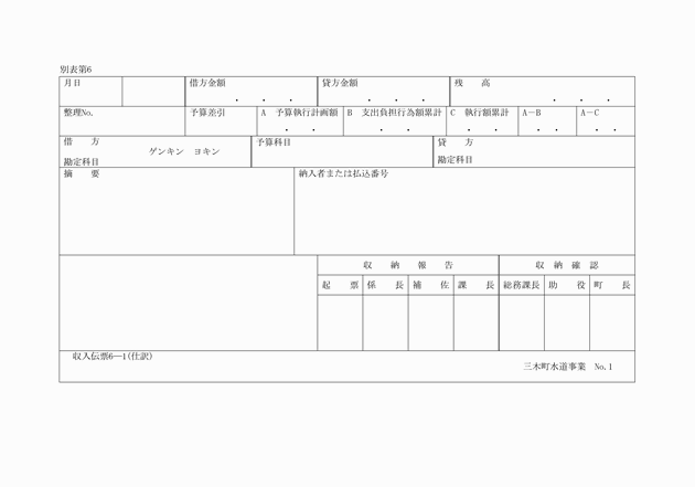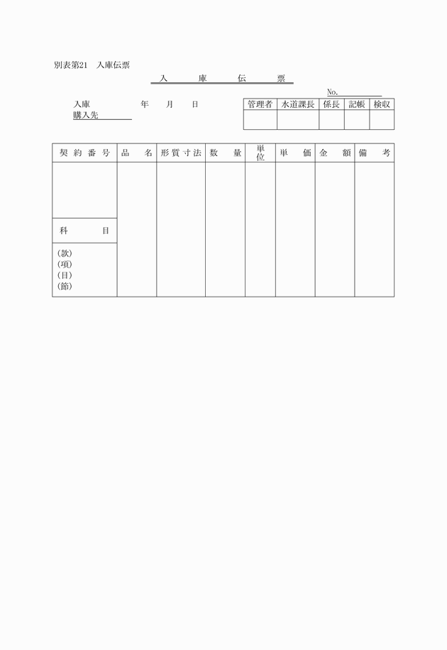 第20条 上下水道課長は、収入の収納を証する書類に基づいて収入伝票(一部現金の収納を含む取引について発行される振替伝票を含む。以下同じ。)を発行し、現金出納簿に記帳するとともに当該収入伝票により収入の収納を証する書類を添付して管理者の決裁を受け、内訳簿のほか収入調定簿に記帳しなければならない。