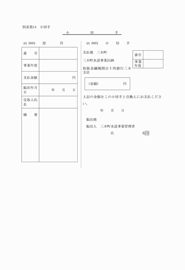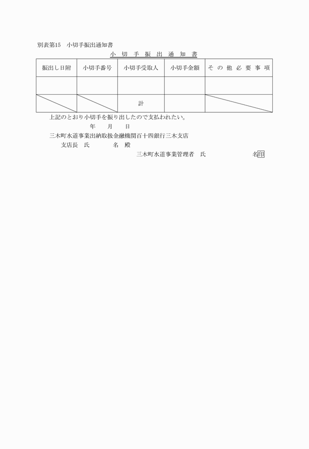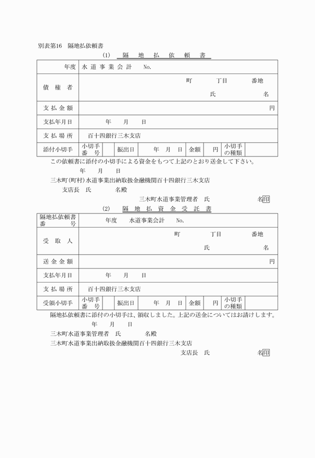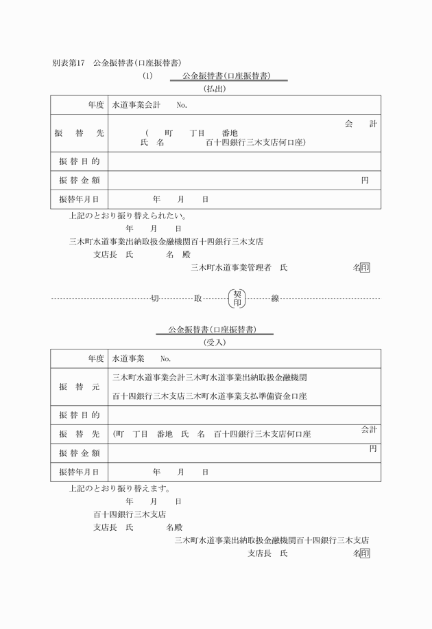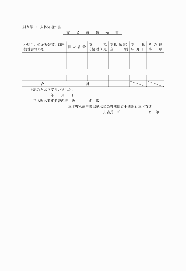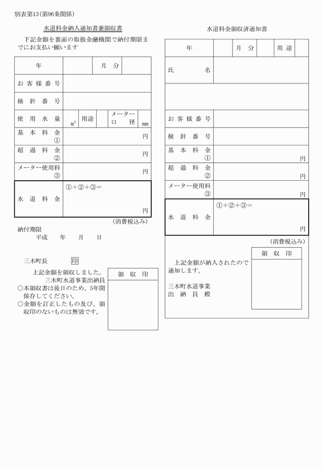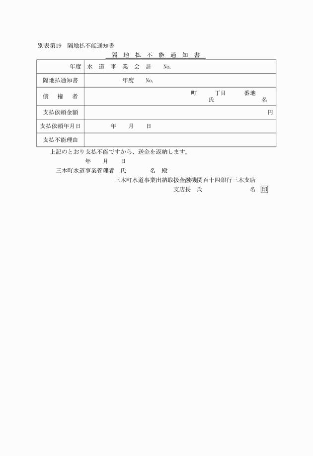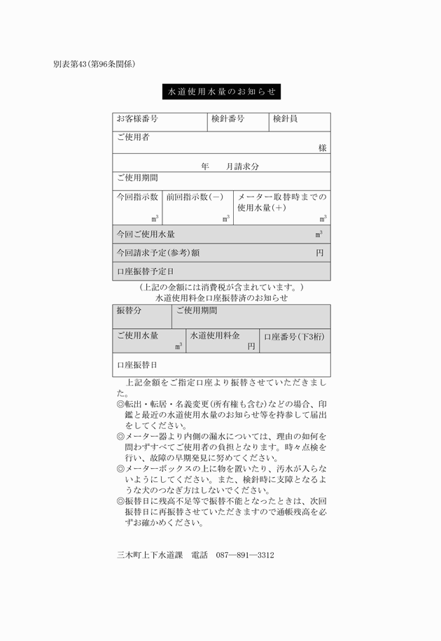 第17条 上下水道課長は、納入通知書を亡失し、若しくは損傷した旨の納入義務者からの届出又は納付された証券が支払拒絶された旨の三木町水道事業出納取扱金融機関若しくは三木町水道事業収納取扱金融機関からの通知を受けたときは、速やかに納入通知書を再発行し、その余白に「何年何月何日再発行」と記載して当該納入義務者に送付しなければならない。