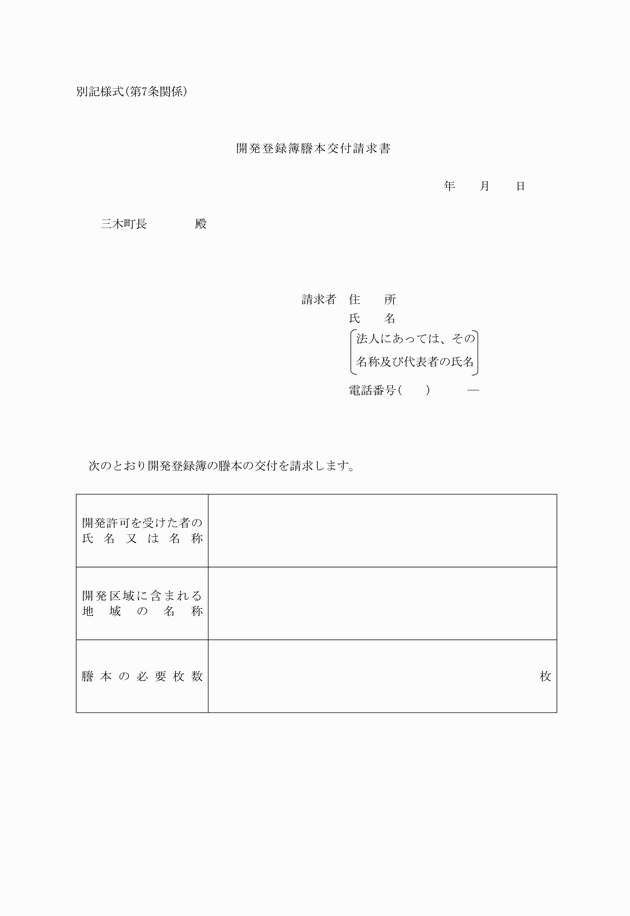 第7条 都市計画法第47条第5項の規定により登録簿の写しの交付を請求しようとする者は、開発登録簿謄本交付請求書(別記様式)を町長に提出しなければならない。