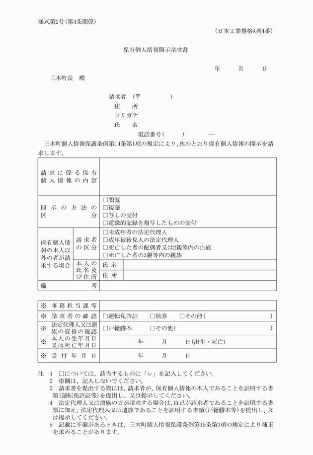 (2) 開示請求をしようとする者が法定代理人である場合 当該法定代理人に係る前号に定める書類及び戸籍謄本その他法定代理人の資格を証明する書類で町長が適当と認めるもの