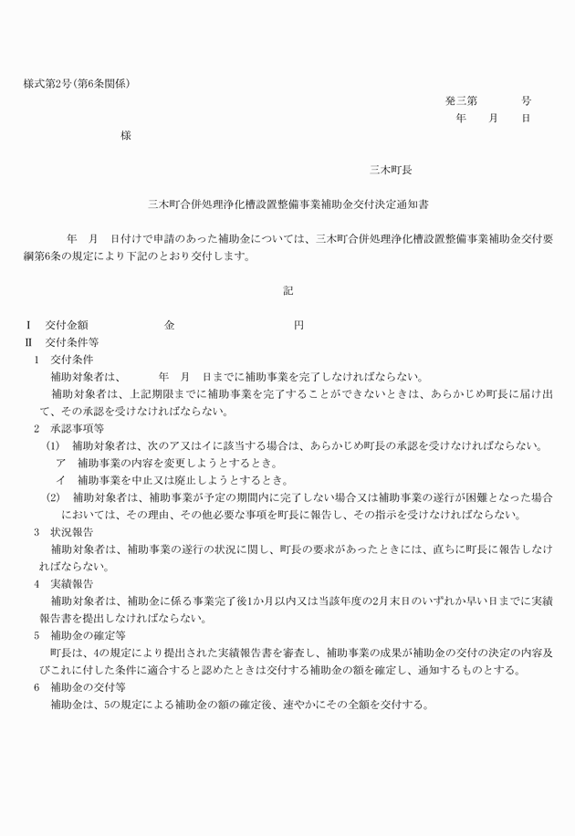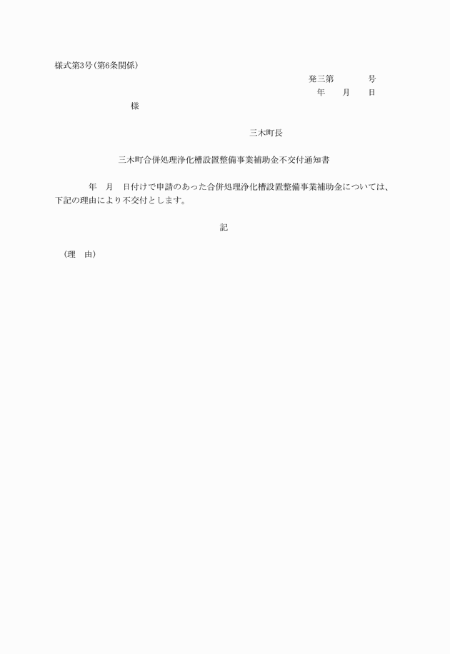 第3条 三木町は、町内において専用住宅に処理対象人員50人以下の合併処理浄化槽を設置しようとするものに対して、予算の範囲内で補助金を交付する。