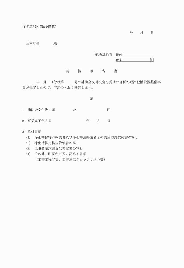 第8条 補助対象者は、補助金に係る事業完了後1月以内又は当該年度の2月末日のいずれか早い日までに実績報告書(様式第5号)に次の書類を添付して町長に提出しなければならない。