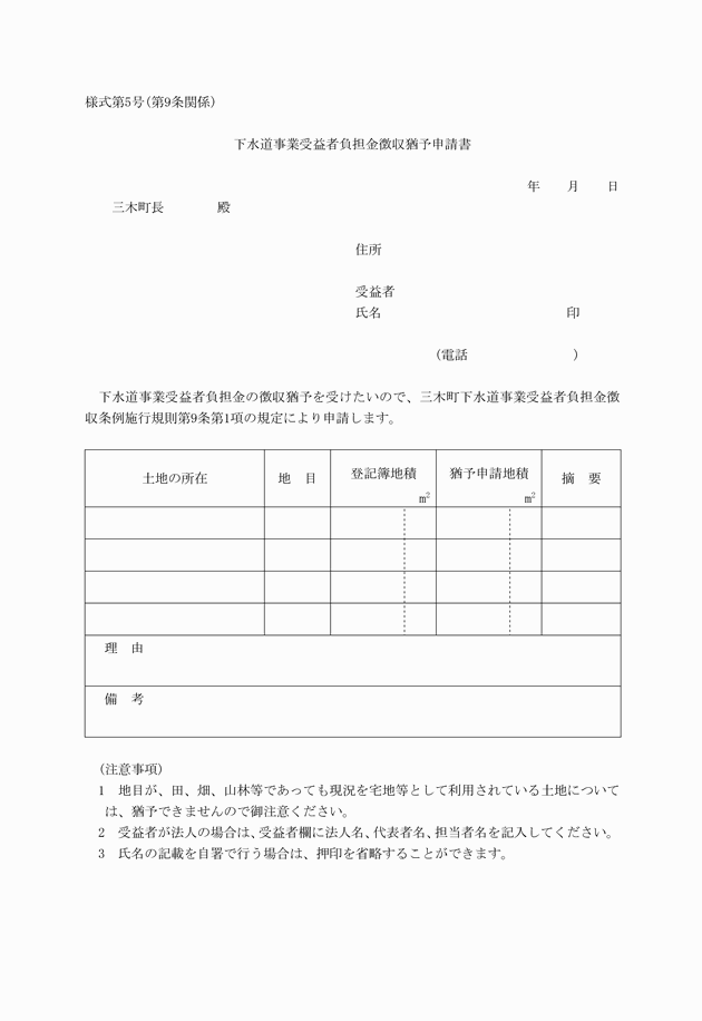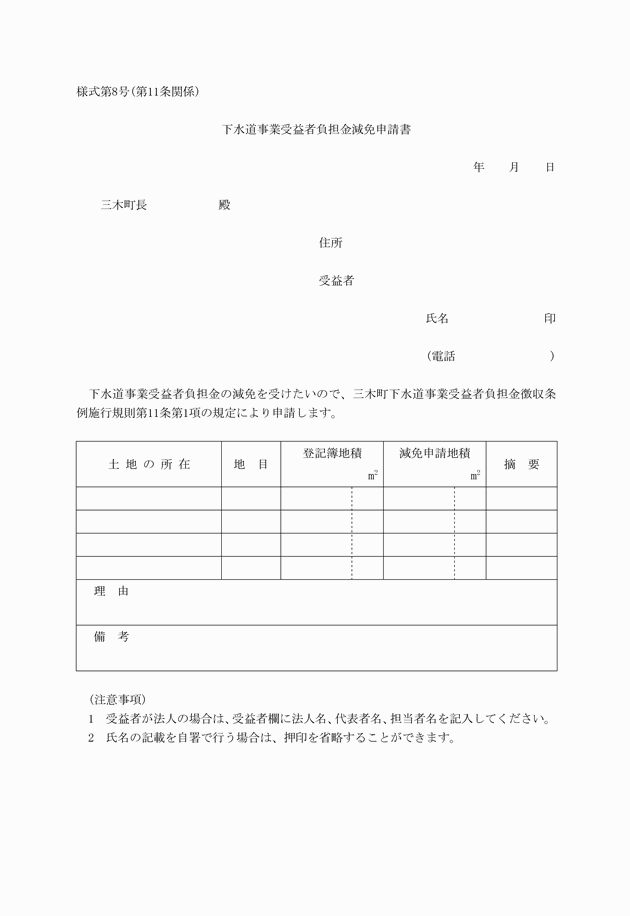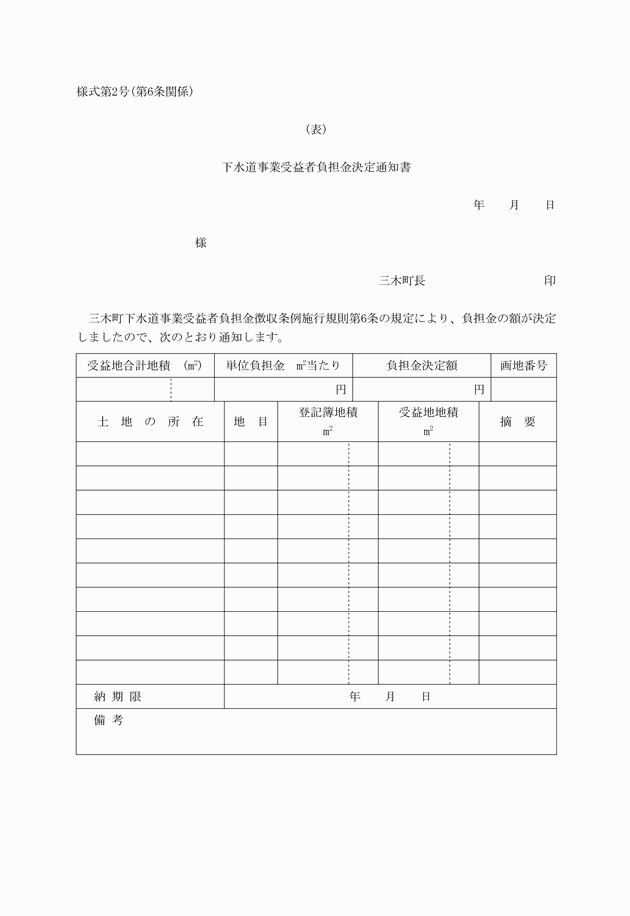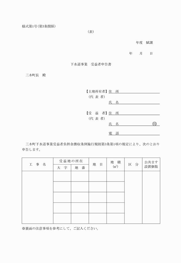 第3条 受益者は、条例第4条の規定による賦課対象区域の公告の日以降において、町長の定める日までに下水道事業受益者申告書(様式第1号)を町長に提出しなければならない。この場合において、受益者が条例第2条第1項ただし書の規定による地上権者、質権者、使用借主及び賃借人(以下「地上権者等」という。)であるときは、土地の所有者とともに連署しなければならない。