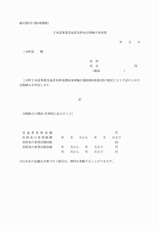 第8条 町長は、負担金の徴収をするとき、特別の理由があると認めるときは、下水道事業受益者負担金分割納入申出書(様式第3号)を提出させ、承認を得たときは負担金を納入書により分割して納付させることができる。
