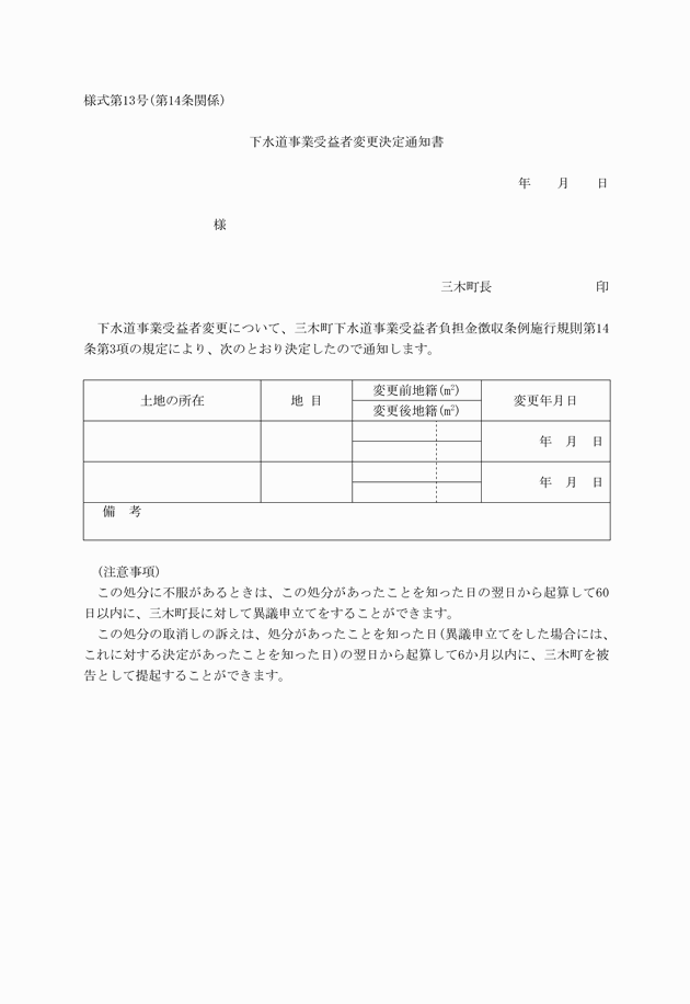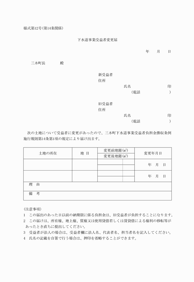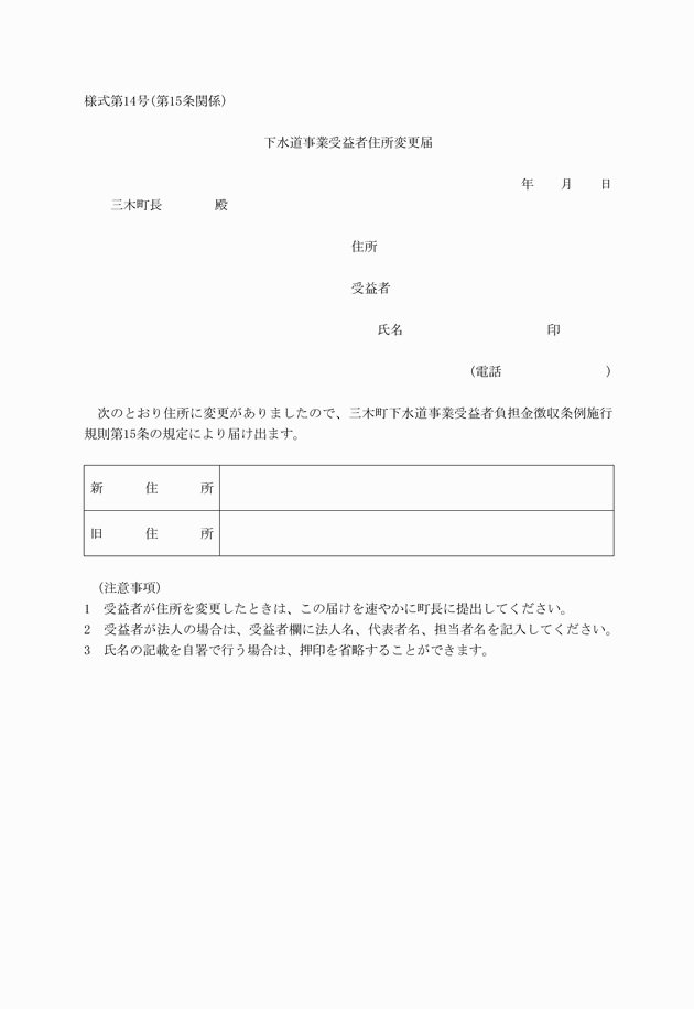 第15条 受益者は、住所を変更したときは、速やかに下水道事業受益者住所変更届(様式第14号)を町長に提出しなければならない。