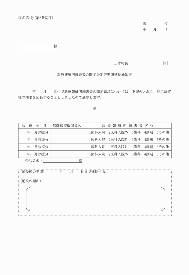 2 町長は、やむを得ない理由により期間内に開示等の決定をすることができないときは、その期間を延長し、診療報酬明細書等の開示決定等期限延長通知書(様式第4号)により請求者に通知するものとする。