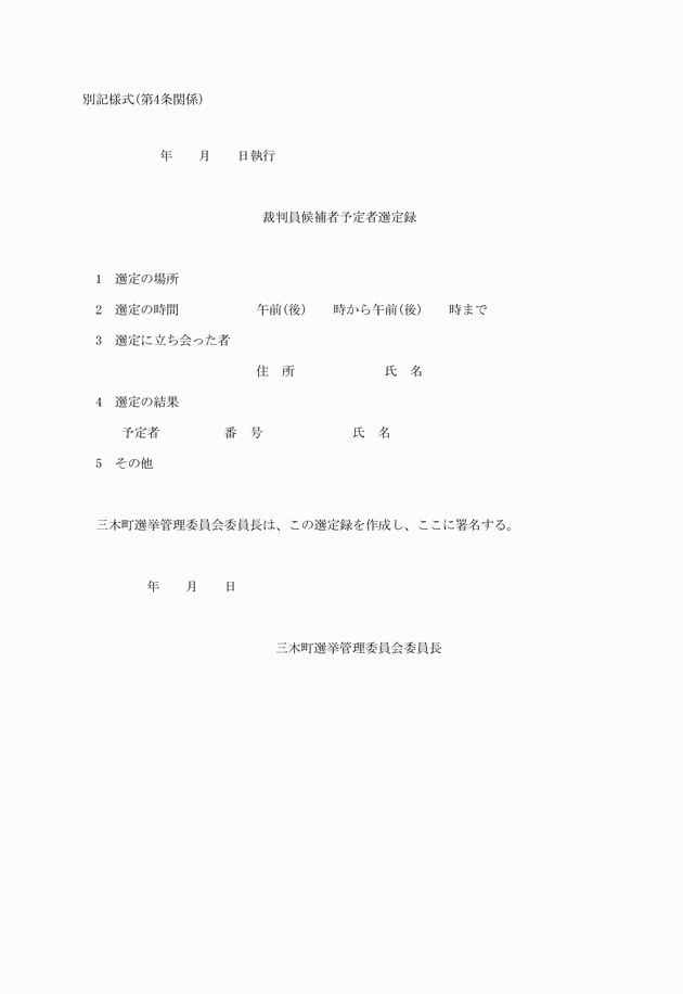 第4条 委員会の委員長は、選定の次第を記載した裁判員候補者予定者選定録(別記様式。以下「選定録」という。)を作成し、これに署名する。