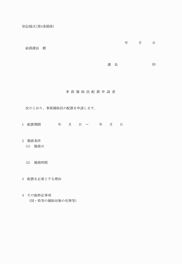 2 所管課長は、事務補助員(庁舎内勤務の者をいう。以下同じ。)を必要とするときは、総務課長に事務補助員配置申請書(別記様式)を提出するものとする。