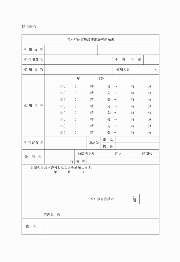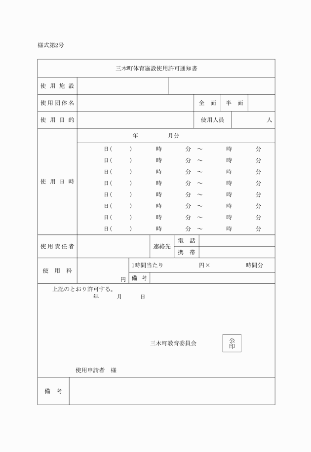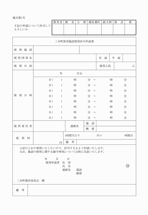 第8条 開放施設を使用しようとする者は、使用する日の属する月の前月20日までに、三木町体育施設使用許可申請書(様式第1号)を教育委員会に提出し、その許可を受けなければならない。